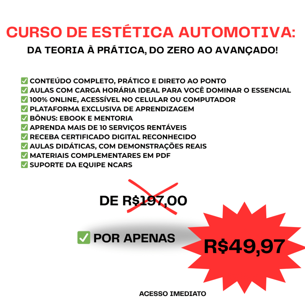 Com o curso Estética Automotiva Ncars, você aprende técnicas profissionais para deixar qualquer carro com aparência de novo — e o melhor: começa a faturar com serviços acessíveis e de alta procura no mercado!